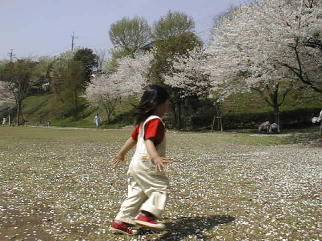 桜吹雪を追いかけている千佳。