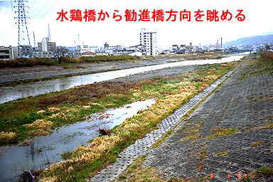 ・東山橋から都心方向、東山方向の眺めがなかなかよい。 ・水鶏橋の近く、雨のためできた飛び石の水たまりを避けながら歩きつづける。
