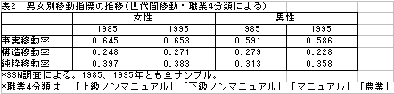図表2.は、1985年と1995年の二回のSSM調査から、男女別に移動指標の趨勢をみたものである。男性の場合、事実移動率は変化していないものの純粋移動率は大幅に増加しており、その意味で産業化仮説は成立しているといえる。ところが女性では、もともと男性に比べて移動率が高く、しかも純粋移動率が不変、もしくはわずかに低下しており、その結果、純粋移動率の男女差は大幅に減少した5)。調査時点が最近の2時点に限られるので結論には慎重であるべきだが、次のことは確かだろう。