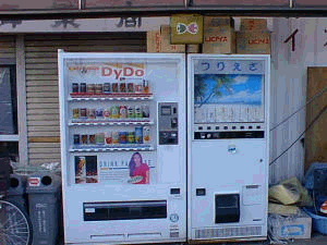 浦安の、とある釣り具屋の店先を撮影してみました。 チョット面白いのが右側の自動販売機です。 何と釣り餌の自動販売機で「みみず」とか「ごかい」 等々、色々な釣り餌が買えます。