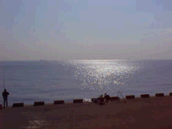 沖にはヨットが行き来し、海岸では太公望が大物の魚を狙っ