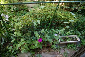 なんだけど、ネット+緑のカーテンの前に、アサガオが咲きまくり