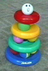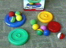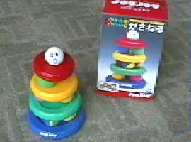 かたいボール5こと、やわらかいボール5こと、トレイからなります。 トレイは裏と表があって、コップかさねより格段に難しい。 あっくんはやわらかいボールがとても気に入っているようです。