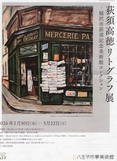 八王子駅北口から斜めに北西に伸びる歩行者専用道路をまっすぐ行って、行き止まりを少し左に行くとある、ビュータワー八王子の2階に八王子夢美術館があります。 私が行ったとき(2026年2月)には、”荻須高徳リトグラフ展”をやっていました。荻須は、佐伯祐三と同時期にパリに暮らした画家です。佐伯と同様にパリの街の風景を描きました。 彼は、油彩以外にカラーリトグラフにも尽力し多数の作品を残しました。主な展示作品は、”雑貨店”、”サン・マルタン運河”、”グラン・カナル”など。 彼の絵は、佐伯の厳しさに比べるとやや甘めの絵です。でも当時のパリの雰囲気をよく表しています。 この展示は、稲沢市荻須美術館のコレクションによりますが、この八王子夢美術館はこのように各地の小美術館のコレクション展示をすることが多いようです。 |