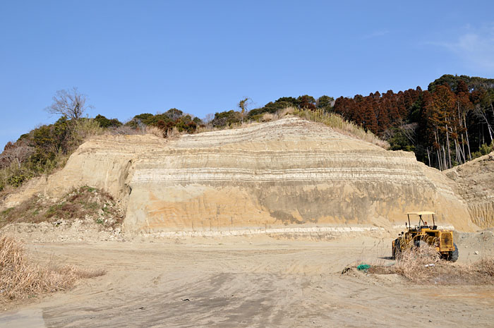 左は富津市の海岸付近に見られる傾斜した地層、右は大多喜町に見られる規模の大きなスランプ構造です。いずれも過去の変動の証拠です。 ![]() ところで、野外で地層を観察すると、どうしても断層やスランプのような刺激的な構造に目を奪われがちです。しかし、この写真のような水平な地層も、りっぱな「地殻変動の証拠」です。 堆積物は海底に水平に堆積します。それが地殻変動によって水平を保ったまま隆起すると、このような水平な地層として陸上に現れます。今は標高約110mの高台になっています。こうした水平な地層も、大きな力が海底を押し上げた変動の証拠なのです。 どのようなしくみで隆起が起きたのか、力の原因は何なのか、わからないことはたくさんあります。大地の成り立ちについて、興味は尽きません。 |