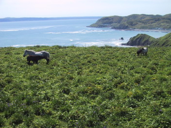 のどかな風景の中、道産子が放牧されている