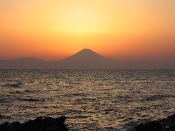 夕日の余韻を残すように、富士のシルエットが海原に浮かび上がった。 |