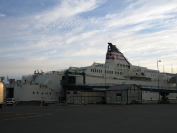 仕事をさっさと片付け家に帰り、急いで荷物をバイクに積み込んで出発、夜の舞鶴道を飛ばす。舞鶴のフェリー乗り場には、9時半ごろ着いた。乗船手続きを済ませてから舞鶴の町に出て食事をしようと思っていたが、乗船開始がいつもより早い10時で、時間がなくあきらめて空腹のまま船に乗り込む。