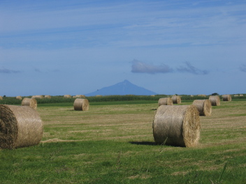 道の両側には、牧草のロールが点在する牧歌的な風景が広がっている。