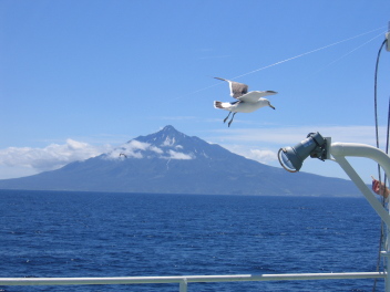 野寒布岬を過ぎて外洋をしばらく進むと、船の左手に利尻富士が大きく浮かび上がる。 |