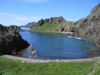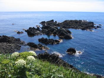 展望台より澄海岬先端を望む。海底が見えるくらいにきれいに澄み切った海の岩場には、高山植物が咲いていた。 |