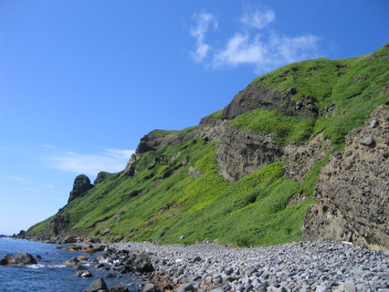 このスコトン岬は、北緯1分差で日本最北端の冠を宗谷岬に譲るが、日本の北のはずれであることには違いない。しかしこの澄み切った真っ青のマリンブルーの海を見ていると、まるで南国の島にいるような感じがする。 |