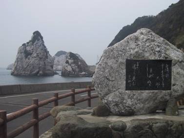 氷山のような奇岩をバックに、万葉の歌が刻み込まれた石碑が建てられていた。 |