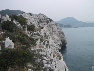 由良港を過ぎ、海岸線を調子よく走っていたら、前方に白崎海岸の白い岩肌が見えてきた。