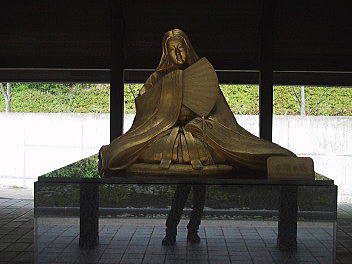 池の向こうの寝殿風の舎の中に金色のブロンズ製の小野小町像があった。