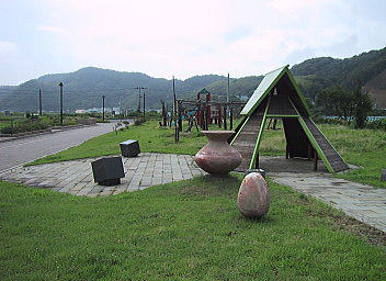 広々としたパーキングの道の駅で、地下には弥生時代前期の遺跡があるところから、古代をイメージするモニュメントを配置した公園も設けられている。