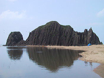 立岩はりアス式海岸で奇岩の多い丹後町のシンボル的な存在の大岩で、竹野川の河口のおだやかな浜に猛々しく立っている。