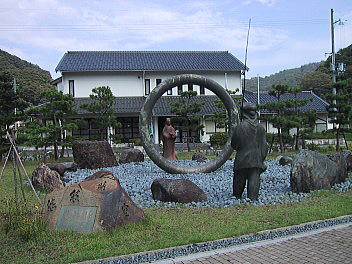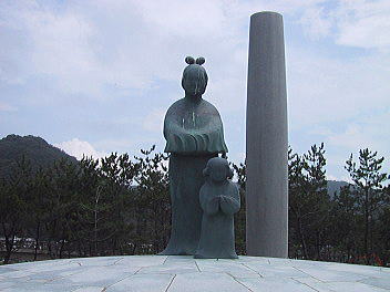 立岩を正面に見据えて、やさしげに母子像が立てられていた。 |