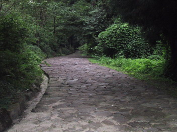 この石畳は、この急な坂の通行の便を図り、大雨による道のぬかるみを防ぐために、自然石を敷き詰めて作られたという。