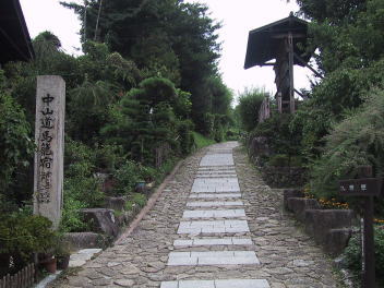 途中で旧中山道に入り狭い道を進むと、急な坂道の途中に落合の石畳があった。