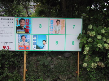 ちょうど長野県知事選の真っ最中で、馬籠の町にも、知事選候補者のポスターが掲示されていた。 |