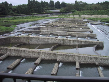 床止工とは、洪水などで河床が流されるのを防ぐために設けられた工作物で、落差があるため、魚の遡上の障害になることがあるが、ここの床止工は魚道が設けらた日本初の全断面魚道付き床止工だそうだ。 |