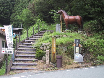 細い道を抜けて行くと、突然CP1戦国夢街道の馬のモニュメントがあらわれた。