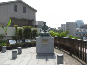 正木観音の横の坂を上ると、そこが芭蕉庵史跡展望庭園で、庭内には芭蕉像や芭蕉庵のレリーフが配されていて、往時を偲ぶことができます。 |