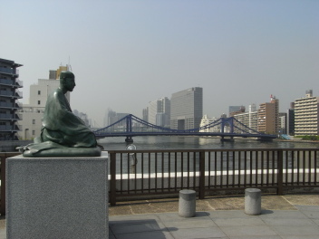 芭蕉庵史跡展望庭園は、ちょうど隅田川と小名木川との合流点にあって、すごく見晴らしがよいところで、庭内からは、隅田川の架橋の中で一番美しいといわれる清洲橋や永代橋、新大橋が眺められます。 |