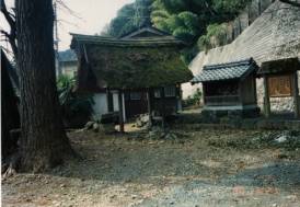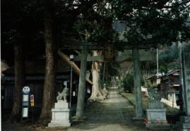 集落の入り口のところに四足門があり、その横に須賀神社があって、参道が真直ぐ山に向かって伸びている。