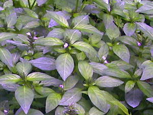 し、花は薄紅紫色の唇形で、穂状に密集してつく。