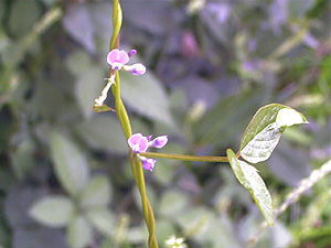 野原や道ばたなどに生えるつる性の1年草。葉は3小葉からなり、両面とも毛がある。