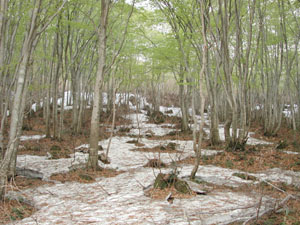 さすがに寒く、新緑のブナ林の斜面には雪がたっぷり残っていた(写真下)。