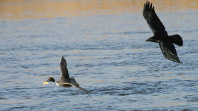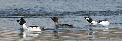 ヒドリガモ、ホシハジロ、オナガガモ、スズガモ、キンクロハジロ、カルガモ、マガモ、ホオジロガモ(写真:左)など。他、ハジロカイツブリ、カンムリカイツブリ。ジョウビタキメス、たくさんのオオジュリンと芦原を群れで鳴き交わしながら移動するメジロ。