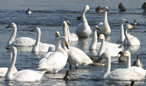 他、群れが一斉に飛び立つと首の長いハクチョウはオット!とかがみ込む。