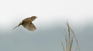 コヨシキリや、オオセッカ(写真:右下)、コジュリン(写真:左下)の声を聞きに!ということで、笹川に6時に着いた。広い芦原のあちこちで盛んにさえずっている。オオセッカは高く舞い上がり、失速するように落ち、オオヨシキリ、コヨシキリはずっと同じところで、セッカは広く飛び回って、コジュリンは、時々移動しながら、みんな思い思いに自己主張していた。朝は日差しがあって暑かったが、だんだん雲が広がり、風が涼しくなる。のんびりと見ていると、ヨシゴイが2羽水辺の近くに降りた、今季初、オイオイという鳴き声がなつかしい〜。ゆったりとアオサギやコサギ、ゴイサギ、アマサギも飛ぶ。