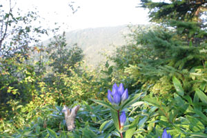 トリカブトの群生と、リンドウの群生、どちらも種類が多く同定が難しい・・・のは私だけ? 案内にはヤマトリカブトが出ていたけれど、カブトの形はツクバトリカブトに似ているが、それぞれの葉にはあまり特徴がない。また宿題(^_^;) (写真:トリカブト) |
