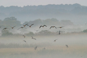 沼や草原全体に薄靄が漂い、その中からわき上がるマガンと賑やかな鳴き声、もう始まっていた。霧中でシャッターを押して、ひとしきりすると、残りのマガンの大放出。