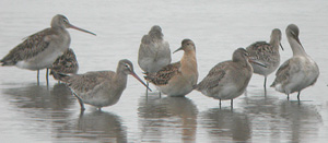 蕪栗沼ではオグロシギ、アオアシシギ、コアオアシシギ、アカアシシギ、エリマキシギ、ウズラシギ、タカブシギ、ハマシギ、セイタカシギが、数は少ないが種類はなかなかだった。(写真:オグロシギと真ん中エリマキシギ)