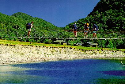 クリントン川の橋の上からグレードハウスを後にして山に向 かう この種の吊り橋は定員一名で、次に渡る人は必ず橋の たもとで待っている。安全のためである。家族同士のパーテ ィでもこれらの規則は厳しく守られていた。