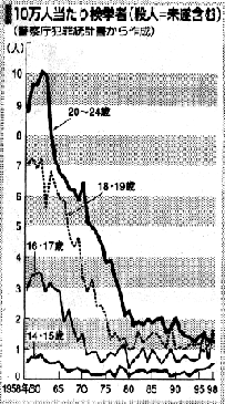 最近青少年の犯罪が増えている、というような情報があふれています。また、少年法を改正して、厳罰化しなければならない、というようなこともしきりに言われています。ところが、その記事によると、統計をちゃんと調べると、実は全然増えていない、むしろ若者の犯罪がピークを迎えていた60年代に比べると大幅に減っているそうです。これは、ほかの先進国の特徴と大きく異なるそうです。被害者数も60年代に比べて4分の1から5分の1に減少しているそうです。