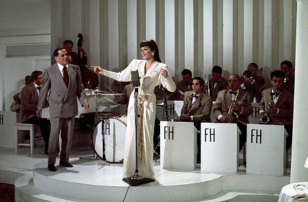 高級キャバレーに、ある青年貴族が通っていて、そこの歌姫(ちょっとお年の)に恋をしてしまいます。彼は絶対に不幸になる、と言われながらも彼女と結婚します。ある日、彼女は他の男性に恋をして、その人とつきあいたいと、青年、つまり自分の夫に言いますが、青年は断ります。その後、彼女は、病気で亡くなってしまいます。で、彼女の残酷な復讐が始まります。 結婚式だか、新婚旅行の時に二人で青い空をバックにアリアの二重唱を歌います。これがなかなかお洒落です。たいへん不思議な映画です。 |