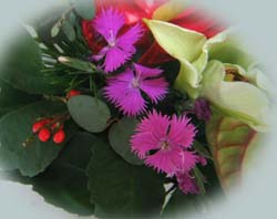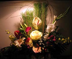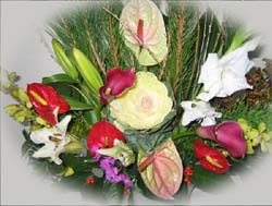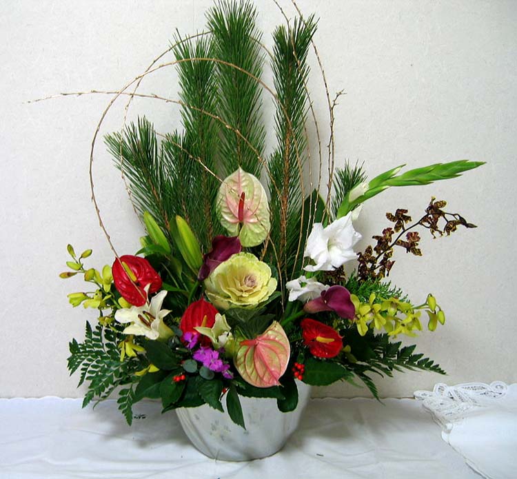 お正月のアレンジメント 松 南天 蘭 葉牡丹 雪柳 グラジオラス アンスリウム カ−ラ− なでしこ |