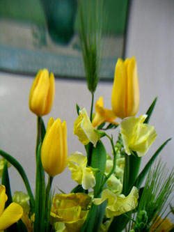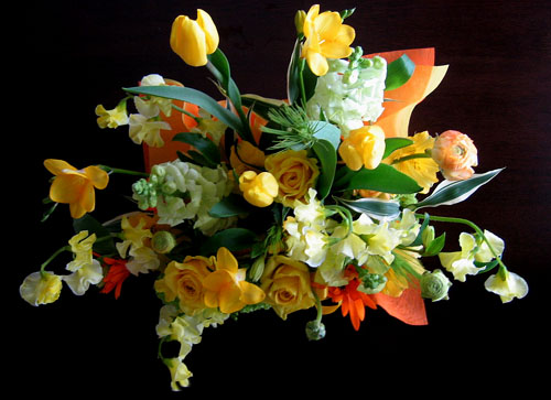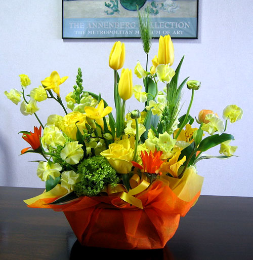 春を告げる花々のアレンジを 友人から頂きました。 明るい黄色の花のアレンジメントは 部屋の中に一足早く春が訪れたようで 元気いっぱいになります。 チューリップ ラナンキュウラス バラ マーガレット スイトピー ストック 麦の穂 |