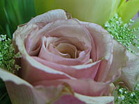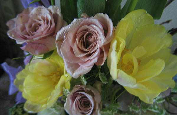 シンビジュウムやバラの間に可憐なレースフラワーを挿しました。