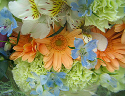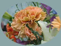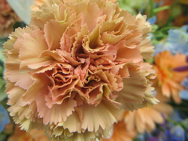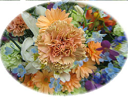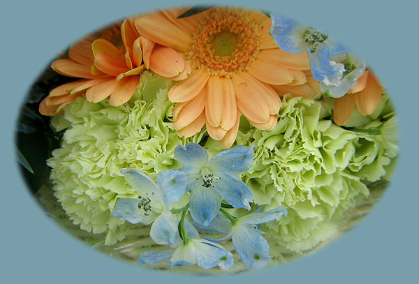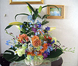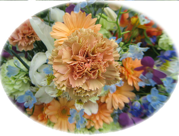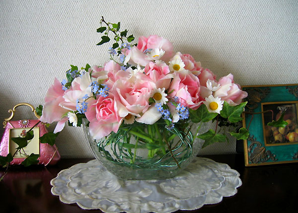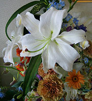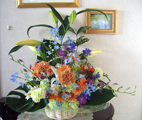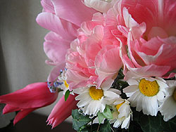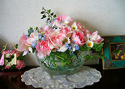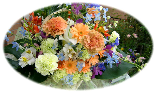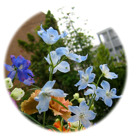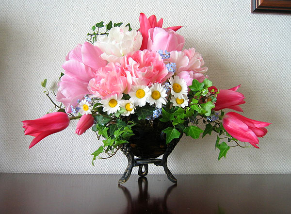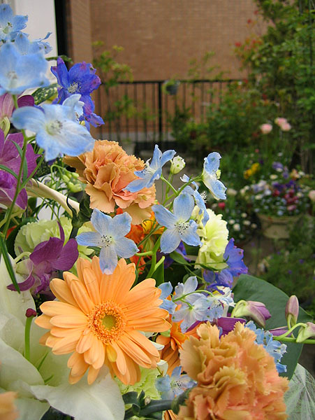 曇天のために室内が暗いので、 ベランダに出て撮影しました。 アレンジの向こうに パンジーやチューリップが 見えています。 ^0^ |