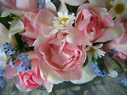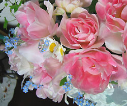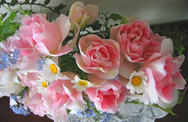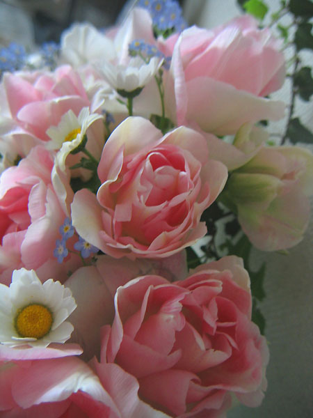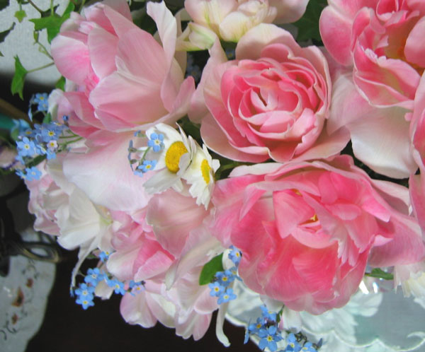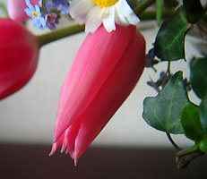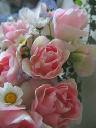 次々にチューリップが 咲いてくれるので、 アレンジに大忙しです。 バラのようなアンジェリケ その奥には ピンクダイヤモンド。 優しいピンクです。 脇には赤いマリオット。 |