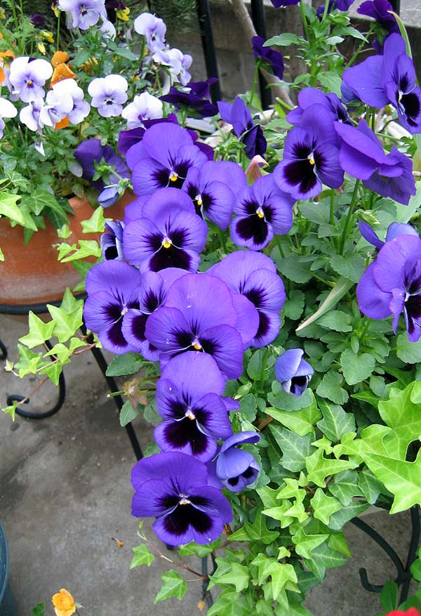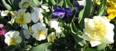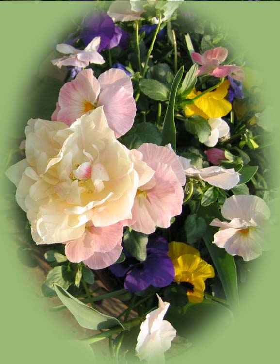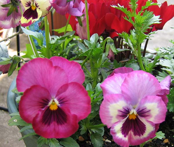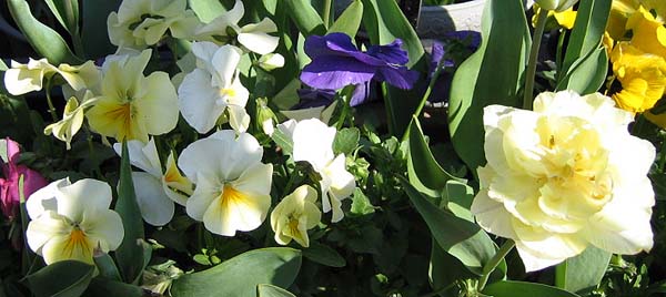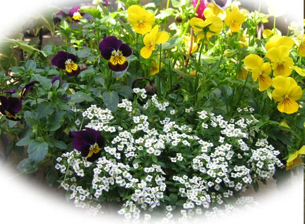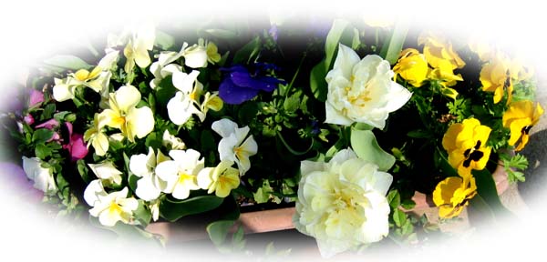 パンジーとビオラです。秋から長いこと咲き続けてくれましたが、暖かい陽射しを浴びてこぼれるように咲き乱れました。