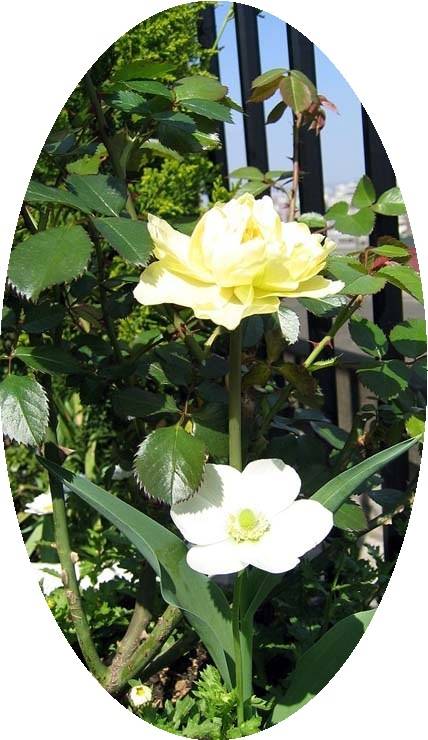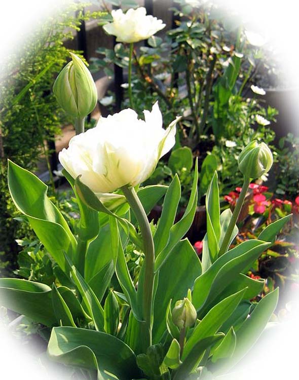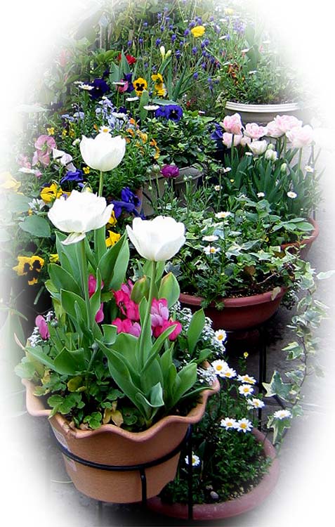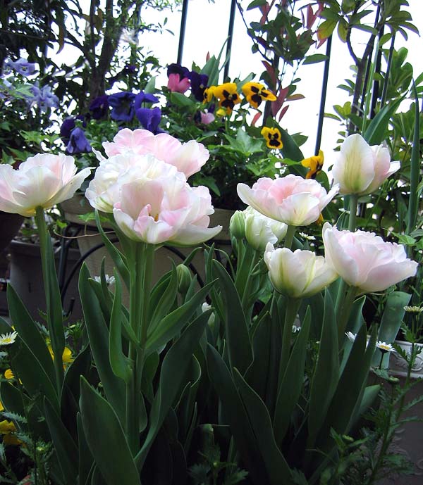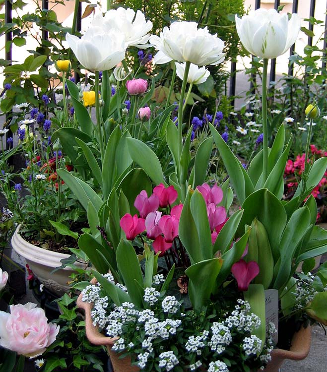 ムスカリ、シクラメン、チューリップ(アンジェリケと、ホワイトマウンテン)、こぼれた種からたくさん咲いてくれたスノ−ポール。スノーポールは5月以降グッと背が伸びて、鉢を席巻します。