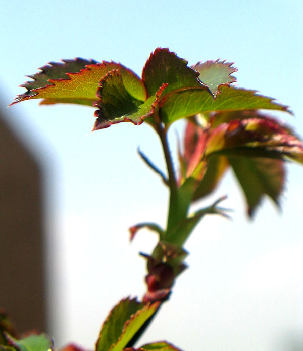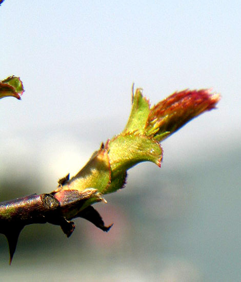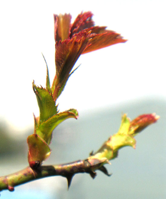 2005年3月中旬 ピエールドロンサール 風の冷たさが柔らぎ、 日中の陽射しが 暖かく降り注ぐようになったら それまで 裸木だったバラの木が 柔らかな新芽を見せてくれました。 感激! |